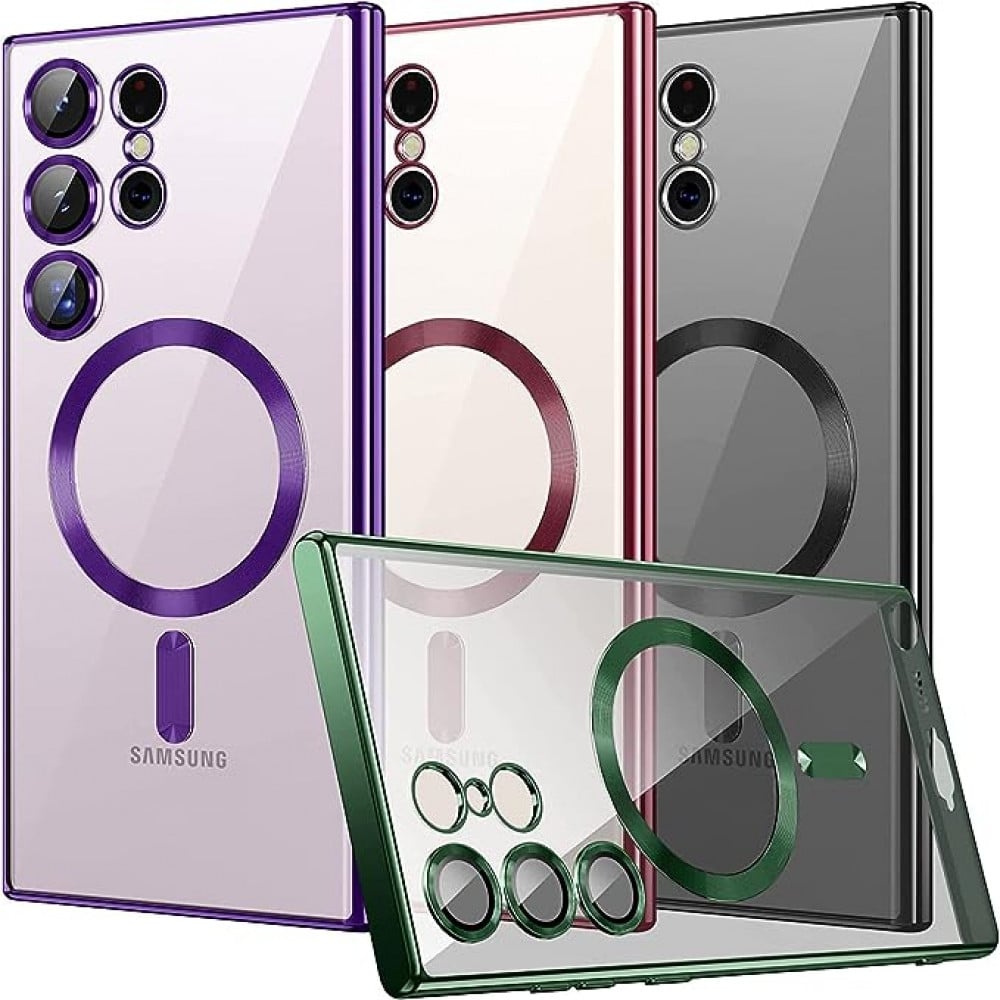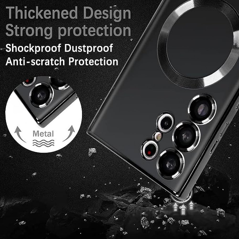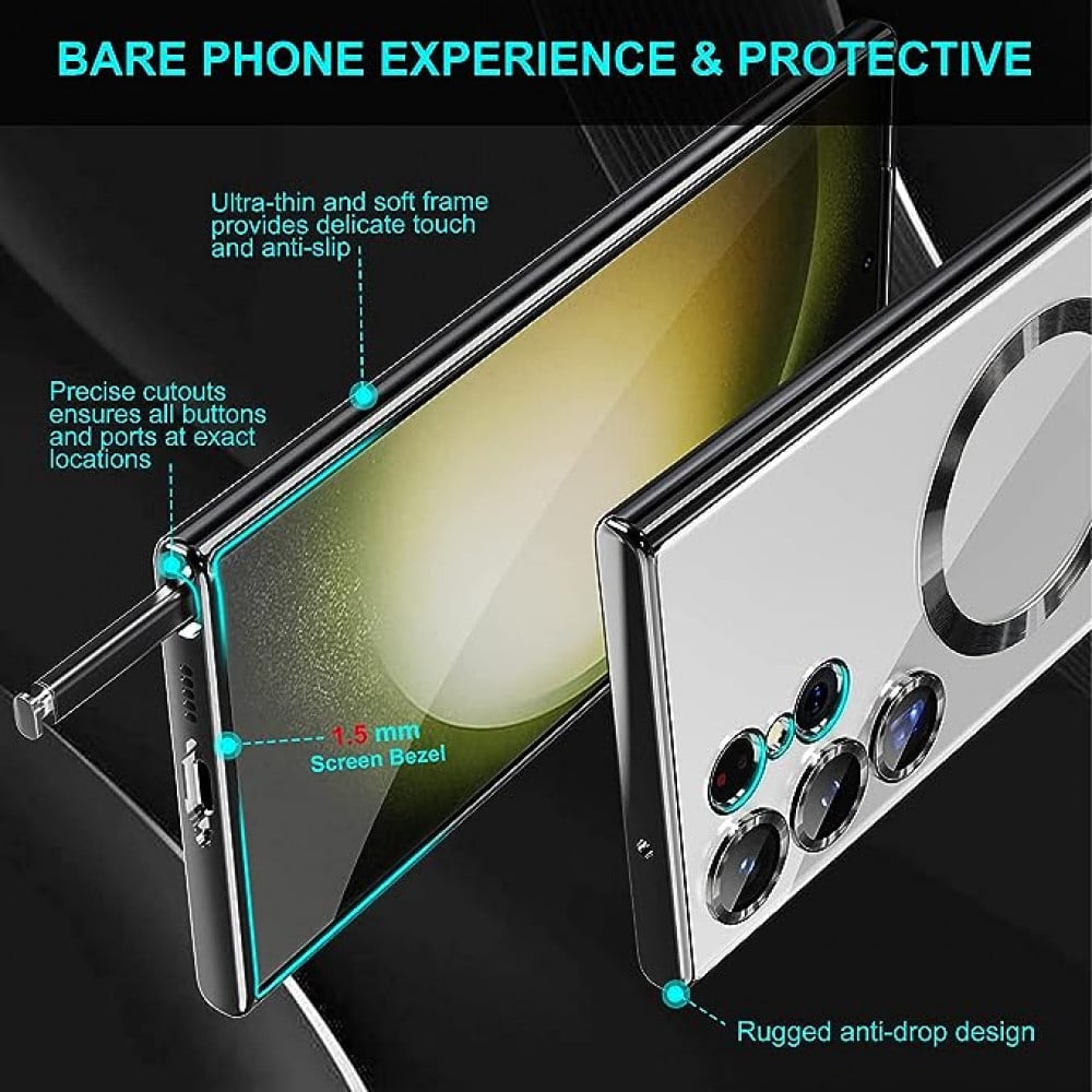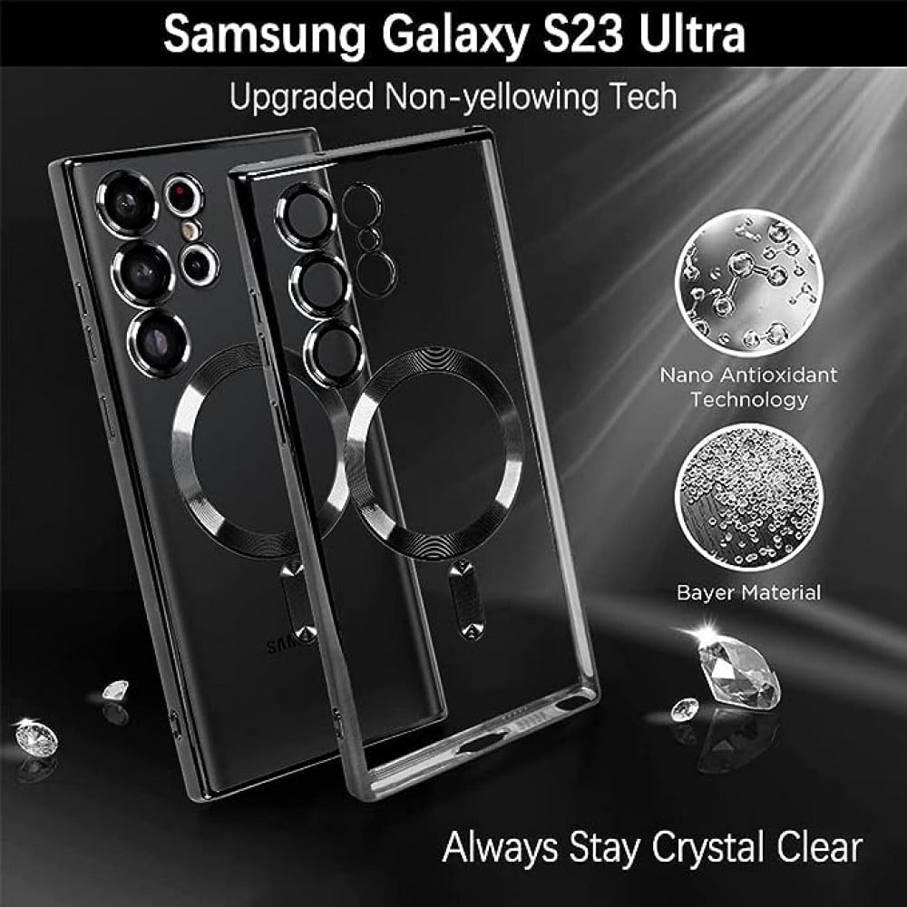 جراب مغناطيسي شفاف لموبايل سامسونج جالاكسي S23 الترا شبكة الجيل الخامس 5G مع واقي لعدسة الكاميرا، متوافق مع ماج سيف، جراب حماية رفيع مضاد للصدمات مطلي بالكهرباء للنساء والرجال من زيهوزا (اسود)