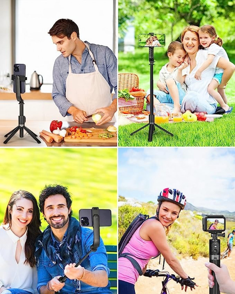 زاوية قابلة للتعديل وحامل جوال قابل للدورانحامل ثلاثي القوائم قابل للتمديد لجوال ايفون مزود بحامل جوال قابل للدوران 360 درجة ورأس دوار 180 درجة، مما يسمح لك باختيار الزاوية المثالية عند التقاط الصور. قضيب تلسكوبي مكون من 7 أقسام يسمح لك بتمديد الحامل ثلاثي القوائم من 8.7 انش إلى 55 انش عن طريق السحب. متوافق مع الجوالات بعرض من 2.4 انش و3.9 انش.