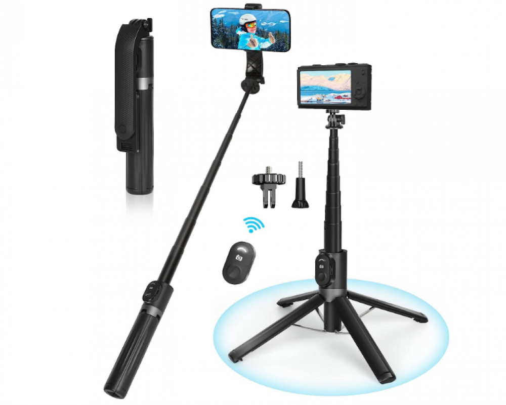 حامل ثلاثي القوائم بتصميم مطور خفيف الوزن ومحمول بتثبيت رباعي بطول 55 انش قابل للاستخدام كعصا صور سيلفي ومزود بجهاز تحكم لاسلكي وموصل كاميرا من اي اوشن، متوافق مع اجهزة ايفون/اندرويد