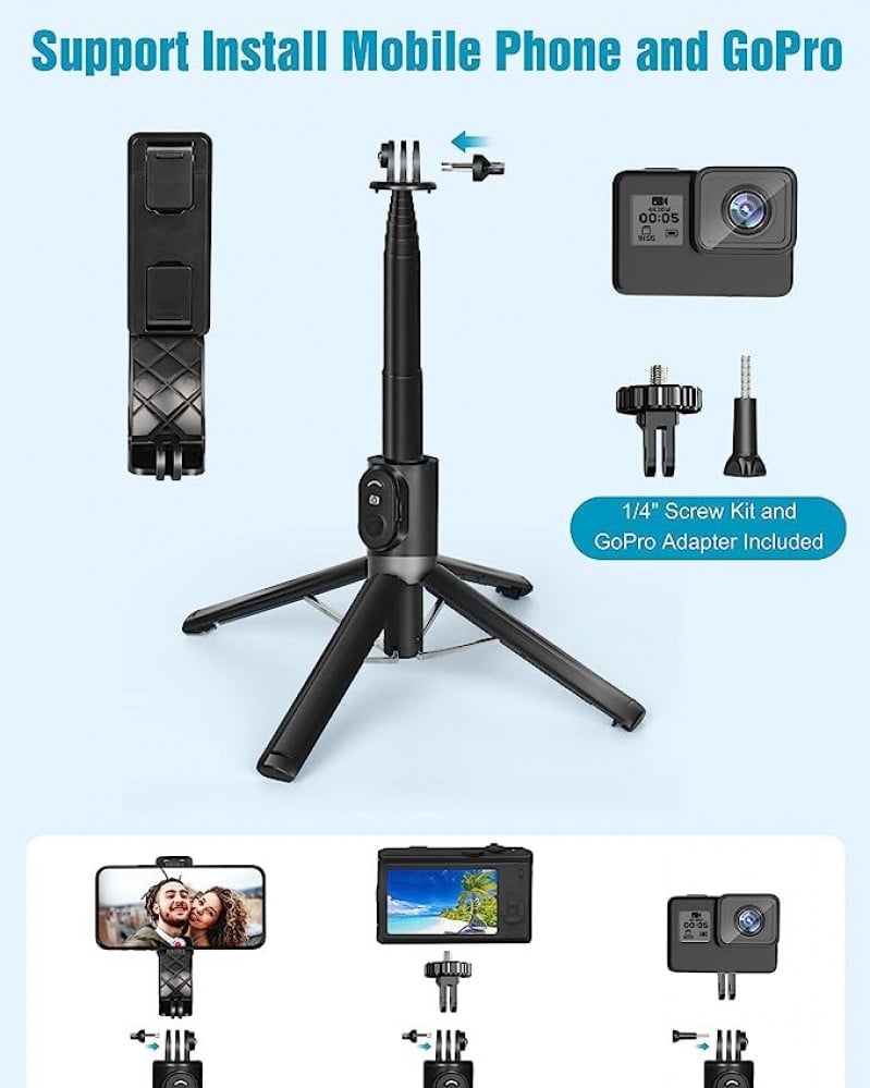 برغي 1/4 انش ومحول جوبرو متضمنلا يمكن استخدام عصا السيلفي المحمولة المزودة بجهاز تحكم عن بعد هذه كحامل ثلاثي القوائم للجوالات فحسب، بل يمكن استخدامها أيضًا كحامل لمعظم كاميرات جو برو وانستا 360 والكاميرات الرقمية. يمكنك استخدامها لالتقاط صور سيلفي أو صور الجماعية أو كحامل جوال للوضع على سطح المكتب لتسجيل مدونات الفيديو ومشاهدة التلفزيون.