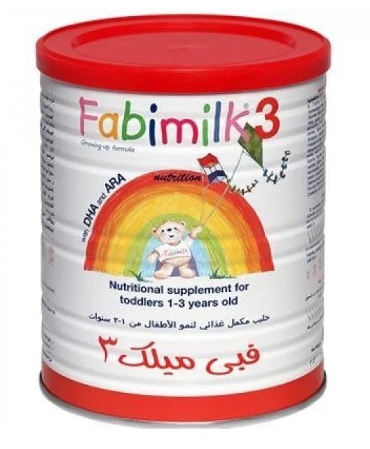 حليب بودرة 900 جرام. خصائص حليب فابي ميلك 3: حليب فابى ميلك المرحلة الثالثة تركيبة للأطفال يمكن إستخدامها من عمر سنة وحتى ثلاث سنوات. يحتوى حليب فابى ميلك المرحلة الثالثة على حمض ديكوساهكسانويك، حمض الأراكيدونيك، لاكتو البيومين، فيتامينات، معادن وألياف مضافة.
