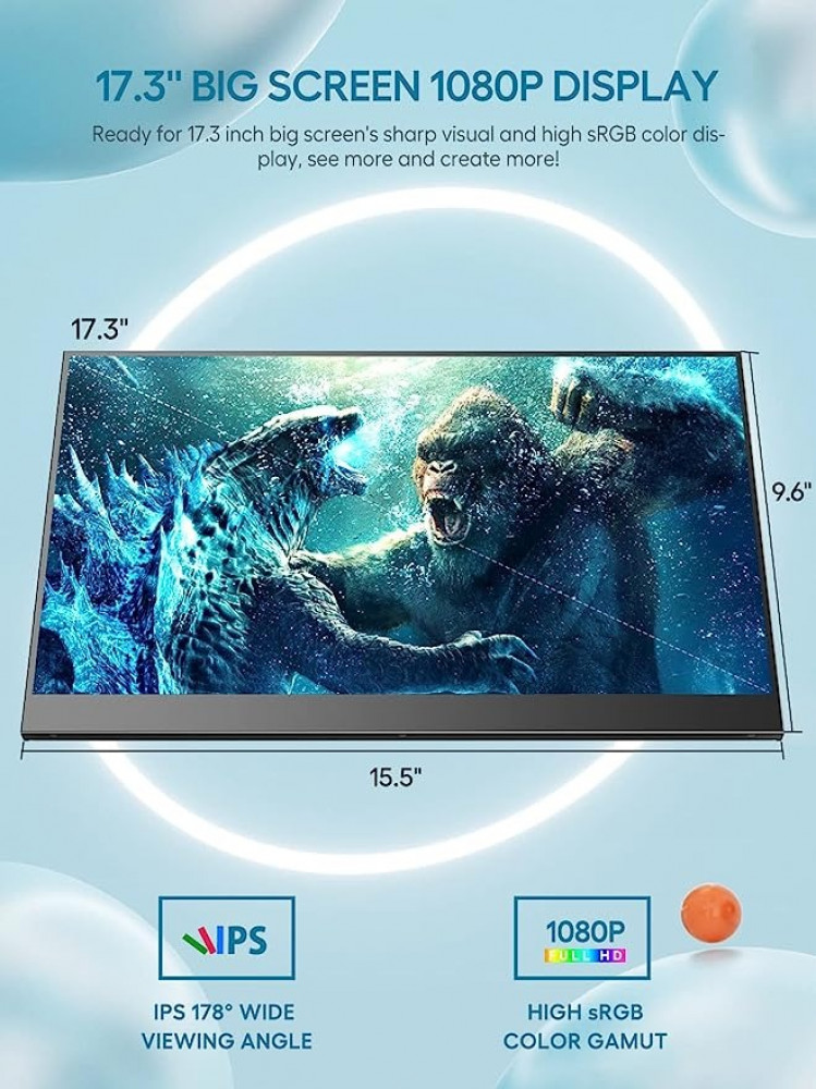 خفيف الوزن وقابل للحمل: مع وزن خفيف بيلغ 2 باوند، يمكنك أخذ شاشة اللابتوب المحمولة هذه في كل مكان دون عبء. تعتبر شاشة اللابتوب ذات مقاس 17.3 انش من يوبيرفيكت مثالية للسفر ورحلات العمل والعروض التوضيحية من الجوال وللترفيه.