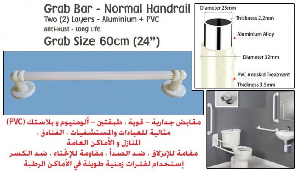 المقبض الجداري للحمام مقاس 60 سم موديل 1546 هو مساعدة يومية مخصصة لسلامة الحركة داخل الحمامات. مناسب للمسنين وذوي الحركة المحدودة ولمن يبحثون عن دعم إضافي عند الخروج والدخول من الدش والمرحاض. يتميز بتركيب بطبقتين من الألومنيوم مغطاة بطبقة PVC لحماية من الصدأ وسطح مريح للمس. يأتي مع تركيبات تثبيت قوية تضمن ثبات المقبض على الحائط عند الاستخدام اليومي. يُستخدم كمكوّن من تجهيزات السلامة المنزلية ولا يغني عن استشارة أخصائي أو فني تركيب عند الحاجة.