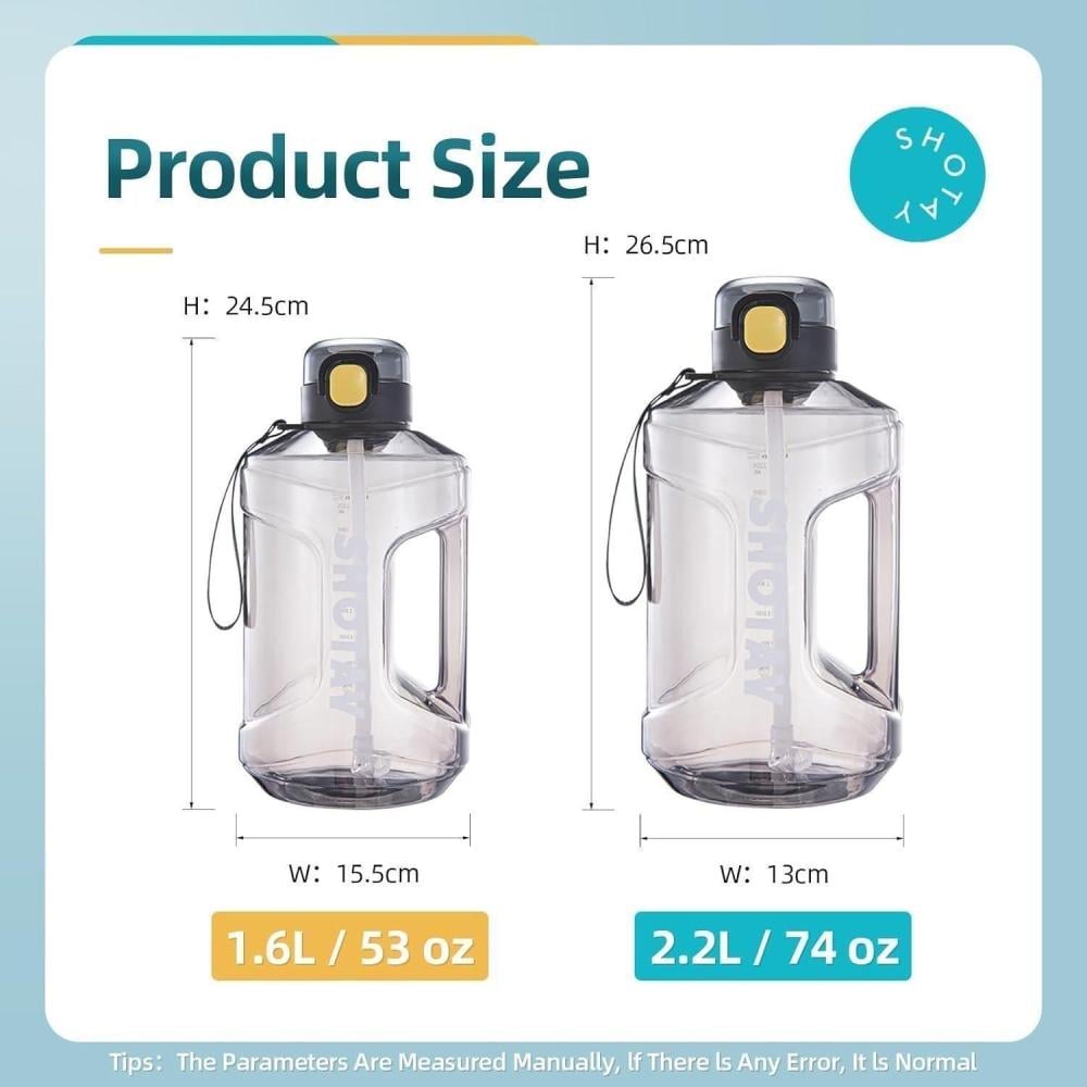 - سعة كبيرة: 1.5 لتر/2 لتر (48/64 اونصة)، يمكنك تتبع مقدار ما تشربه - بفضل زجاجات المياه بسعة نصف جالون الخاصة بنا والتي تأتي مع علامات زمنية واضحة على الجانب حتى تتمكن من رؤية كمية المياه اليومية التي شربتها.