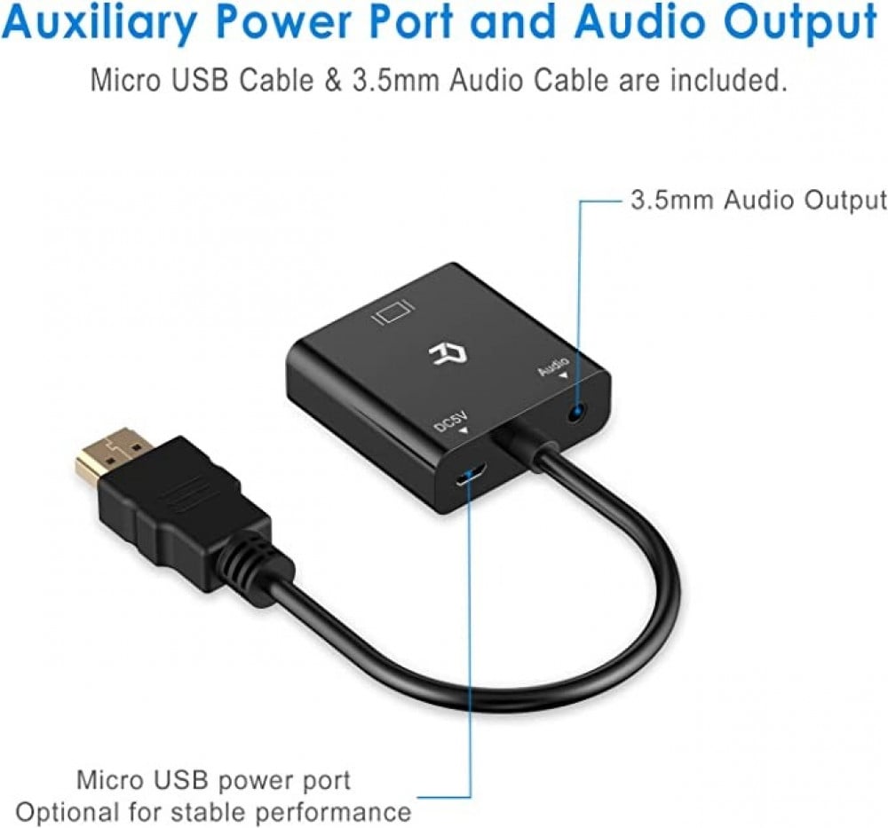 يدعم محول اتش دي ام اي إلى في جي ايه دقة تصل إلى 1920x1080 (1080 بي دقة فائقة) بما في ذلك 720 بي و1600x1200 لشاشات اتش دي أو أجهزة العرض عالية الدقة. يمكن توصيل منفذ الصوت بسماعة الرأس ومكبر الصوت والأجهزة الأخرى