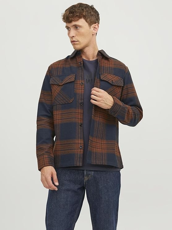 قميص جيه بروي بأكمام طويلة ونمط مربعات وقبة صغيرة للرجال من جاك اند جونز - كامبريدج براون