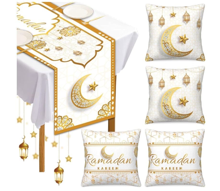 مفرش طاولة للزينة في رمضان بتصميم مطبوع بكلمة «Ramadan» من 5 قطع مع 4 أغطية وسادات زينة من يواولتي (لون أبيض)