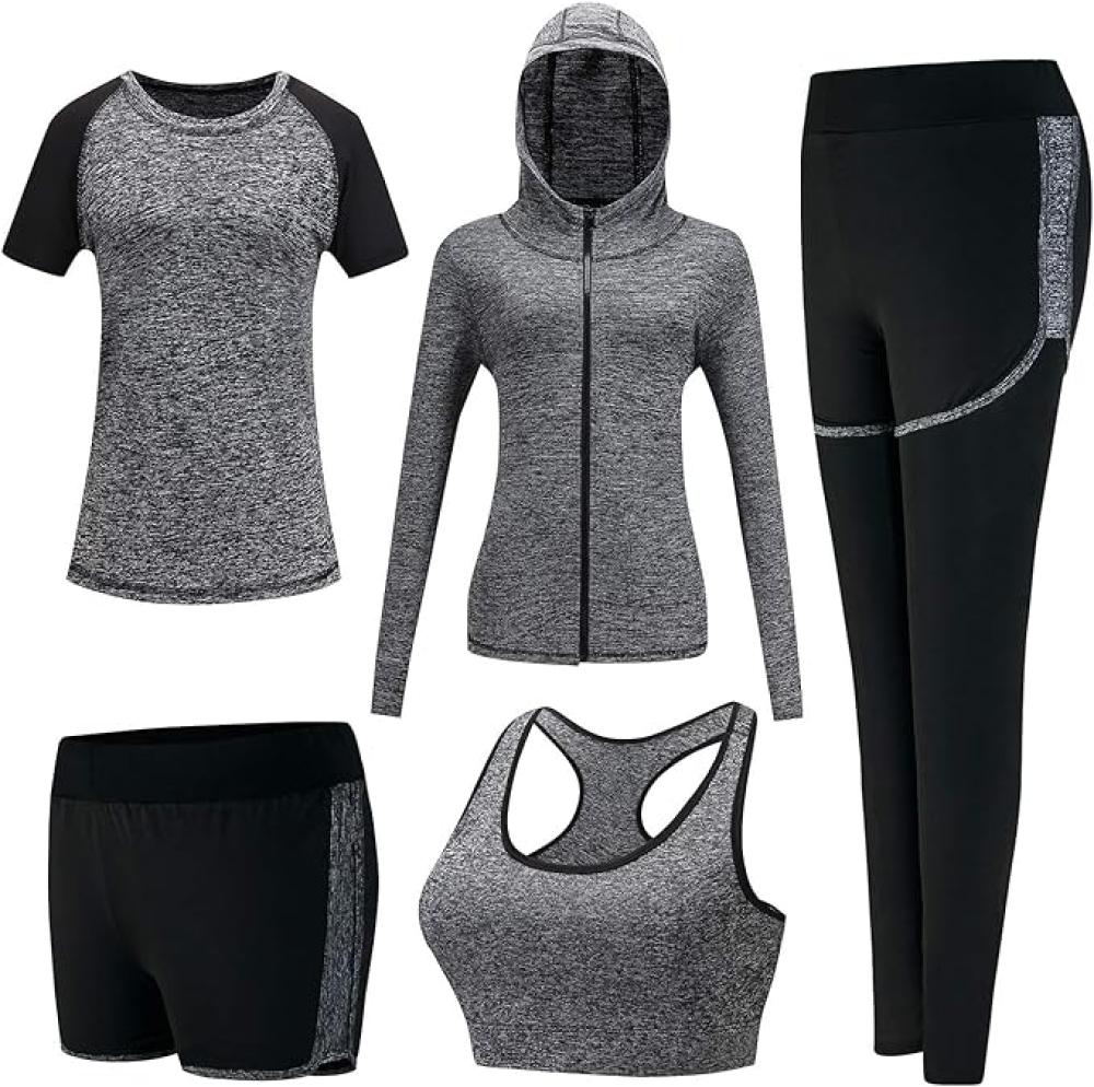 - [محتويات العبوة] 5 قطع من طقم بدلة اليوغا وصالة الألعاب الرياضية للنساء يتضمن ---حمالة صدر رياضية مبطنة وتي شيرت بأكمام قصيرة وشورت رياضي للركض وسروال ضيق وجاكيت رياضي.