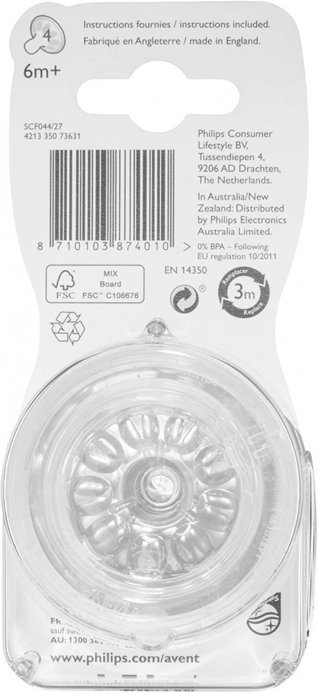 حلمة ناتشورال فائقة النعومة بتصميم حلزوني مرن، تشبه الثدي بشكل كبير من فيليبس افينت. تسمح البتلات المريحة وشكل الحلمة الطبيعي بامتصاص طبيعي وتسهّل الجمع بين الرضاعة من الثدي والرضاعة من الزجاجة. تعزّز الحلمة العريضة التي على شكل الثدي التثبيت الطبيعي على غرار الثدي، مما يجعل من السهل لطفلك الجمع بين الرضاعة الطبيعية والرضاعة من الزجاجة. البلات داخل الحلمة تزيد من النعومة والمرونة دون انكماش الحلمة. jتميز فيليبس افينت ناتشورال بتصميم مبتكر بصمام مزدوج مصمم لتقليل المغص وعدم الراحة عن طريق تصريف الهواء إلى الزجاجة وليس إلى بطن الطفل. تتوافق منتجات فيليبس افينت مع بعضها البعض وسهلة التبديل، مما يساعد على الانتقال من مرحلة حديثي الولادة إلى مرحلة سن المشي. يمكن استخدام الزجاجات والحلمات مع مضخة الثدي المريحة من فيليبس افينت، وحاوية التخزين والأكواب وأدوات التعقيم ومسخن الزجاجات. عبوة من حلمتين، تدفق سريع ومضادة للمغص.
