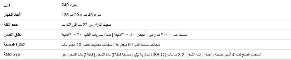 المواصفات: الوزن: 240 جم | أبعاد الجهاز: 135 مم × 45 مم × 20 مم | الشاشة: شاشة OLED | معلمات القياس: BP (SYS&DIA)، MAP، PP، PR، ECG | مكان القياس: أعلى الذراع | نطاق القياس: BP: 0-300 مم زئبق / PR: 40-200/دقيقة / HF: 30-250/دقيقة | حجم الكفة: 22 بوصة بوصة سم - 42 سم | ذاكرة مدمجة: سجلات BP: 50 مجموعة / سجلات ECG: 10 مجموعات | البطارية: بطارية ليثيوم مدمجة قابلة لإعادة الشحن؛ استخدام المنتج لمدة 4 أشهر بشحنة واحدة | وقت الشحن: 2-3 ساعات | عمر البطارية: 300 قياس ضغط دم أو 800 قياس ECG | محتويات العلبة: 1 × جهاز مراقبة ضغط الدم مع ECG. 1 × 1 × كابل شحن دليل المستخدم، 1 × دليل البدء السريع