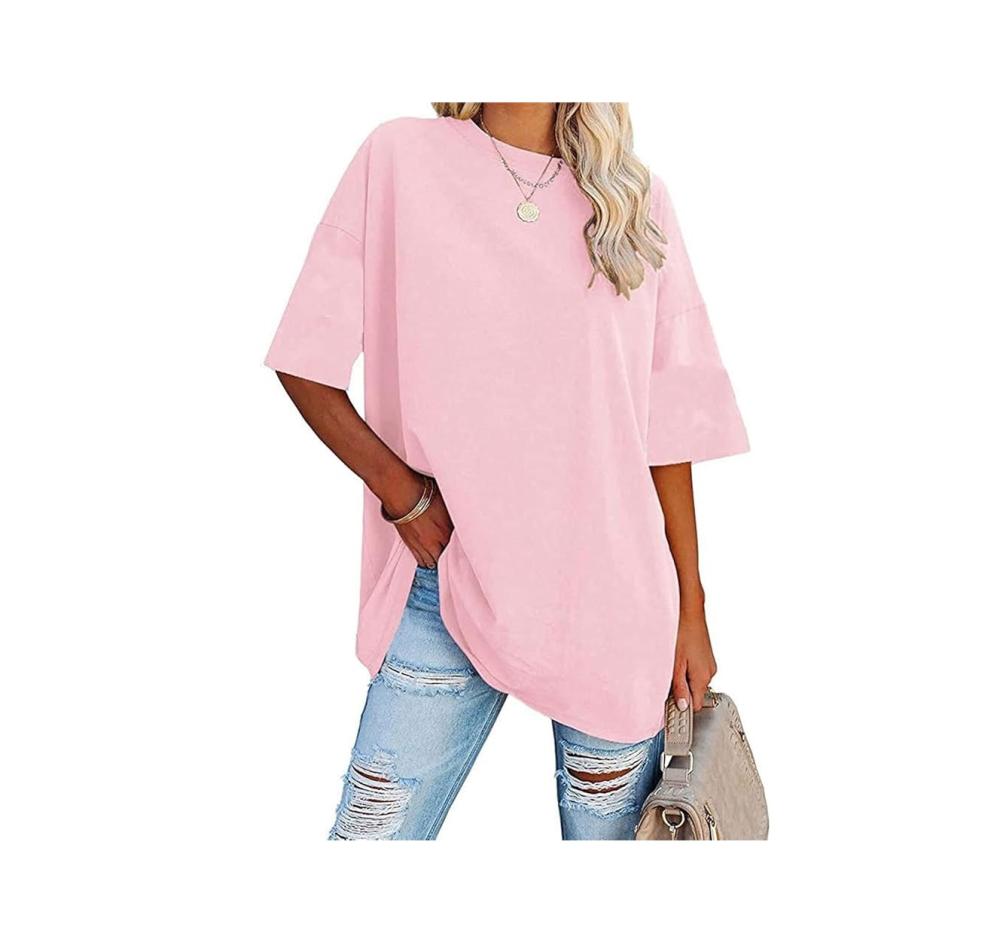 تي شيرت كبير الحجم للنساء بقصة فضفاضة وقبة دائرية ضيقة وأكمام قصيرة، بلوزة كاجوال صيفية واي تو كيه سادة 2024