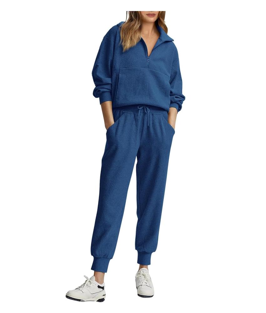 ملابس نسائية من قطعتين بأكمام طويلة وقبة V ونصف سحاب مع بنطلون رياضي أطقم استرخاء بجيوب من بي تي اف بي ام