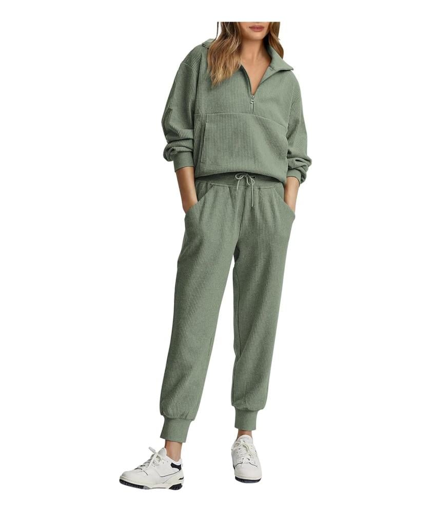ملابس نسائية من قطعتين بأكمام طويلة وقبة V ونصف سحاب مع بنطلون رياضي أطقم استرخاء بجيوب من بي تي اف بي ام