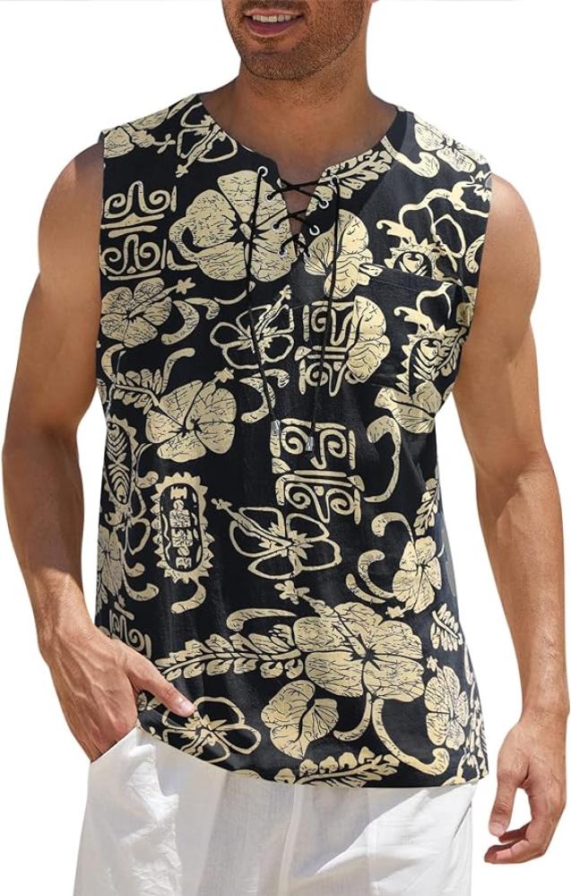 تيشيرت كاجوال هيبي للرجال من القطن والكتان بأكمام قصيرة ورباط للشاطئ من كوفاندي