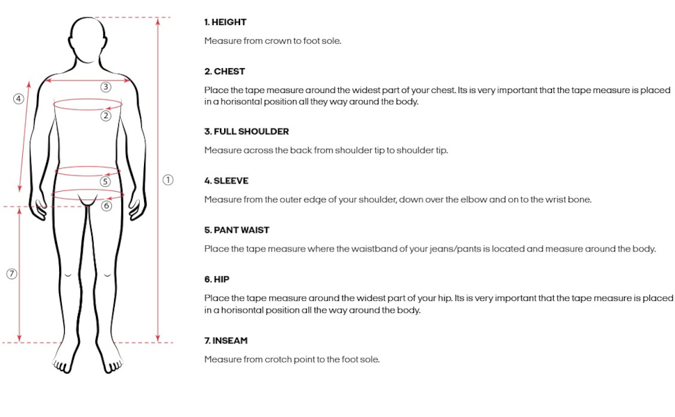 الطول: القياس من أعلى الرأس حتى أعلى الكعب- الصدر: ضع شريط القياس حول أوسع جزء من صدرك، من المهم للغاية وضع الشريط بشكل أفقي حول جسمك